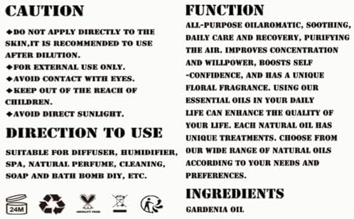INGREDIENTS: Our premium Gardenia essential oil is 100% pure plant extract, carefully steam-distilled to preserve its vibrant, true-to-nature fragrance. Each batch is laboratory-tested to ensure premium quality and consistent performance.