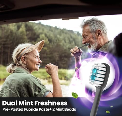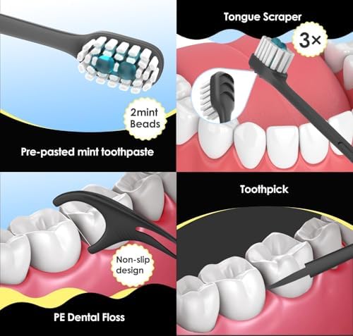 Comprehensive oral care in one compact tool. Your toothbrush comes packed with dental essentials: toothpaste, mint beads, floss, a foldable toothpick, and a wider tongue scraper.