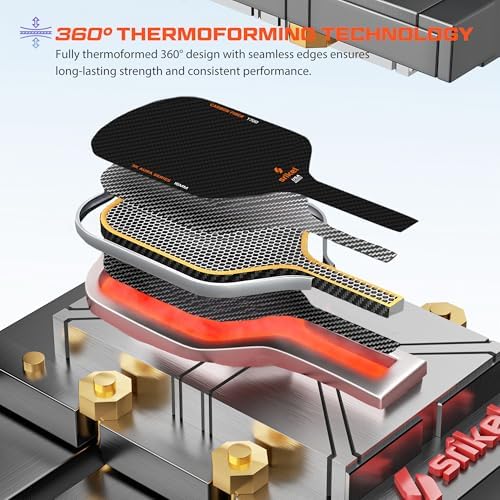 Our Srikel Aura series pickleball paddle is equipped with 360° thermoforming technology, ensuring excellent rigidity and strength. This technology allows the paddle to withstand high-intensity hits while maintaining stability and rebound. The fully carbon-encased structure, created with cutting-edge thermoformed technology and foam-injected walls, provides unparalleled strength and stability. The enhanced sweet spot is ideal for aggressive players, offering the perfect combination of power and control.